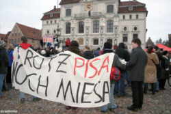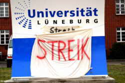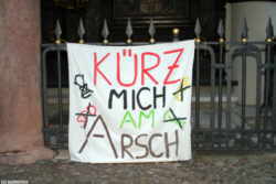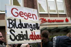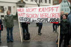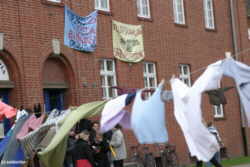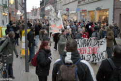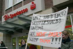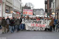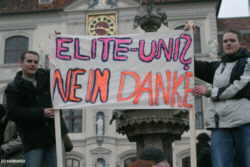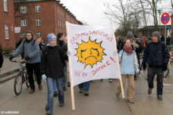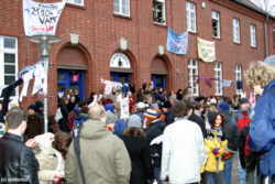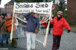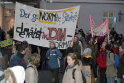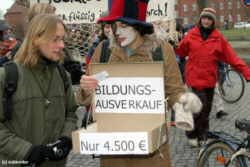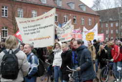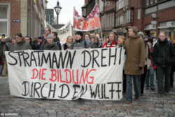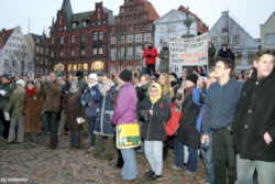 fotografie / presse-archiv© Gisela und Joachim Petersen, subkonturKontakt: siehe Startseite STARTSEITE Kreativer Protest bei Studentendemonstration durch die Innenstadt LüneburgsBunt ging es zu auf dem Uni-Campus, wo sich am 20. Januar 2004 etwa 1400 StudentInnen zu einer Protestdemonstration versammelten. Viele „letzte Hemden“ flatterten an langen Wäscheleinen vor dem Gebäude 9 und zeigten symbolisch die Situation vieler Anwesender, sollten tatsächlich Studiengebühren eingeführt werden. Satirisch treffend die Text-Metaphern auf Großtransparenten wie: „Strathmann dreht die Bildung durch den Wulff.“Dann bewegte sich ein langer, plakatbunter und zuweilen lauter Zug vom Campus in die Lüneburger Innenstadt. Während häufiger kurzer Stopps wurden Protest- und Kampfbereitschaft skandiert: „Sie wollen kürzen, wir werden kämpfen!“ Dann wieder erklang aus vielen Kehlen eine Variante des allbekannten Sesamstraßenliedes: „Wer, wie, was, wieso, weshalb, warum – wer nicht zahlt bleibt dumm.“ Auf dem Platz Am Sande angekommen, sorgten die StudentInnen für Aufsehen und auch Erheiterung, als sie auf Kommando ein Bildungssterben inszenierten und sich zu Hunderten auf den Boden fallen ließen. Einen weiteren sinnfälligen Halt gab es dann vor dem Hauptgebäude der Sparkasse an der Münze. Hier wurde laut und öffentlich die ironische Frage nach der Kreditwürdigkeit studienverarmter StudentInnen gestellt. Sie gipfelte in der erstaunt geäußerten Erkenntnis, dass in Bezug auf die Studiengebühren ein Kreditpotential von etwa einer halben Million Euro vor dem Eingang zur Sparkasse stehe. Den Abschluss der Demonstration bildete dann eine Kundgebung auf dem Marktplatz. Hier sicherte der Regionalvorsitzende des DGB Dietrich den StudentInnen die Unterstützung der Gewerkschaft zu. Als sehr erfreulich ist die Tatsache zu bewerten, dass die StudentInnen den geplanten Bildungsabbau in einem engen Kontext mit dem Sozialabbau in dieser Gesellschaft verstehen, was sie in mehreren Redebeiträgen und ferner auf etlichen ihrer Plakate zum Ausdruck brachten. Weitere Informationen gibt es beim ASTA der Universität Lüneburg. Die folgenden Fotos können als JPG 750x500 zur Ansicht geladen werden. Wir weisen in diesem Zusammenhang ausdrücklich auf unser Copyright hin! | |