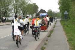 fotografie / presse-archiv© Gisela und Joachim PetersenKontakt: siehe Startseite STARTSEITE Weg vom Atomstrom - Fahrradstaffel für einen StromwechselX-tausendmal quer - Hamburg Arbeitsgruppe FahrradstaffelROBIN WOOD Hamburg, 24.04.2004 Pressemitteilung STROMWECHSEL JETZT! Umweltschützerlnnen werben heute mit einer Fahrradstaffel durch Hamburg für Ökostrom Vor dem AKW Krümmel haben Umweltschützerlnnen heute Vormittag eine Fahrradstaffel gestartet, mit der sie zum Wechsel des Stromanbieters ermuntern wollen. Die Tour, zu der die Initiative X-tausendmal quer, ROBIN WOOD und viele anderen Umweltgruppen aufgerufen haben, wird bis zum Sitz der Betreibergemeinschaft Windstrom Wedel in der Werkstatt 3 in Hamburg-Altona führen. Zwischendurch wollen die Radlerlnnen an etlichen Stellen anhalten, um Passantlnnen darüber zu informieren, wie einfach und sicher ein Wechsel zu einem Okostrom-Anbieter ist. Mit der Fahrradstaffel erinnern die Hamburger Umweltschützerlnnen auch an die Katastrophe von Tschernobyl, die sich am 26. April zum 18. Mal jähren wird. Vor dem HEW-Kundenzentrum an der Spitalerstraße wird aus diesem Grund ab 15:00 Uhr eine Mahnwache abgehalten. Uber die Folgen der Reaktorkatastrophe in Tschernobyl wird der Münchner Professor Edmund Lengfelder am Abend in einer Live-Schaltung berichten. Lengfelder ist maßgeblich am Aufbau und Betrieb eines Schilddrüsenzentrums im weißrussischen Gomel beteiligt. "Auch 18 Jahre nach dem Tschernobyl-UnfaII sind die Folgen dieser Reaktorkatastrophe noch nicht abschätzbar", weiß Lengfelder. "Zehntausende der 800.000 Aufräumarbeiter sind bereits tot. Im am stärksten betroffenen Weißrussland nimmt der Schllddrüsenkrebs nach einem dramatischen Anstieg immer noch zu. Im zehnfach dichter besiedelten Westeuropa - mit 200 Reaktoren - wären die gesundheitlichen und sozialen Folgen einer solchen Katastrophe noch weitaus schlimmer." Im Wissen um die unbeherrschbaren Gefahren der Atomenergie hat sich die Mehrheit der deutschen Bevölkerung gegen die Nutzung der Atomenergie ausgesprochen. Trotzdem wird nach wie vor knapp ein Drittel des in Deutschland produzierten Stroms in Atomreaktoren erzeugt. Gut die Hälfte stammt aus Kohlekraftwerken, deren Abgase das Klima erheblich belasten. Auch die Hamburgerlnnen, die ihren Strom bei der HEW beziehen, unterstützen auf diesem Wege - überwiegend ungewollt - die Atomindustrie. Dabei ist der private Ausstieg ganz einfach. "Trauen Sie sich! Wechseln Sie zu einem ökostrom-Anbieter und wir kommen gemeinsam dem Atomausstieg ein Stückchen näher", appellierte eine Sprecherin der Fahrrad-Crew an die Hamburgerlnnen. Nach der Tour wird gefeiert. Ab 17 Uhr beginnt in der Werkstatt 3 in Hamburg-Altona eine Party mit Musik und Informationen über alternative Stromquellen. Für Rückfragen: Jürgen Fahrenkrug, X-tausendmal quer - Hamburg, 0179 / 991 37 58 Bettina Dannheim, ROBIN WOOD, 0171 / 835 95 15 und ROBIN WOCD-Pressestelle, 040 / 380 892 0 Folgende Organisationen beteiligen sich an der Kampagne STROMWECHSEL JETZT! AIDA - Aktionäre im Dienste des Ausstiegs, Betreibergemeinschaft Windstrom Wedel, ContrAtom Buchholz, Deutsche Umweltstiftung Germersheim, Deutscher Jugendbund für Naturbeobachtung, Eurosolar - Regionalgruppe Hamburg, Grüne Jugend Lüneburg, Hausstrom Saarlandstraße, Hamburg, IPPNW (Internationale Arzte gegen den Atomkrieg) - Regionalgruppe Hamburg, Öko AG attac Hamburg, REGENBOGEN Bergedorf, RadioAktiv (Sendung auf FSK Hamburg, 93,0 MHz /101,4 Kabel), ROBIN WOOD, SAND Hamburg, Tschernobylgruppe Hamm-Horn, Umweltgruppe Elbvororte, VERBRAUCHER für unbelastete Nahrung, X-tausendmal quer - Regionalgruppe Hamburg Fotos von der Tour werden im Laufe des Tages veröffentlicht unter: www.stromwechsel-jetzt.de/pressebilder Die folgenden Fotos können als JPG 750x500 zur Ansicht geladen werden. Wir weisen in diesem Zusammenhang ausdrücklich auf unser Copyright hin! | |