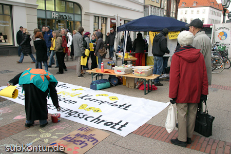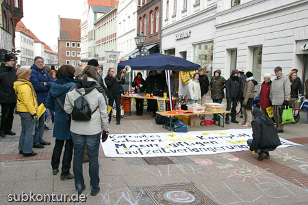 Mit einem „Info- und Mitmachtisch“ hat das Lüneburger Aktionsbündnis gegen Atom (LAgA) am Samstag im Rahmen des bundesweiten "Castor-Strecken-Aktionstages" auf den anstehenden Castortransport von Karlsruhe ins Zwischenlager Nord bei Lubmin aufmerksam gemacht und dazu ermuntert, sich an den Protesten am 16./17.02. entlang der Transportstrecke zu beteiligen.