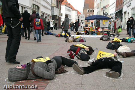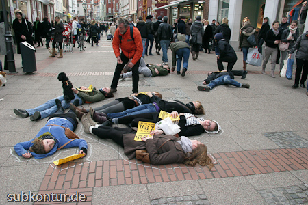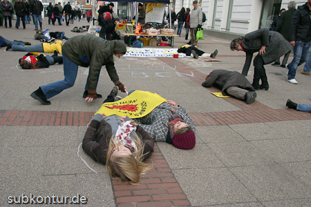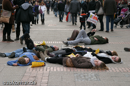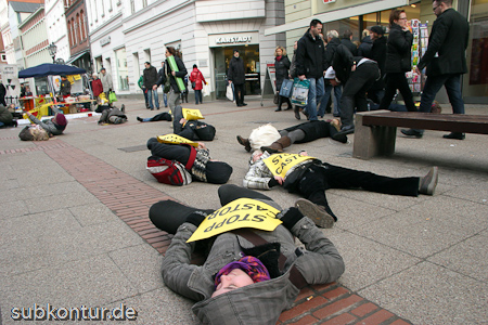 Von 11-14 Uhr gab es in der Bäckerstraße Informationen und Gespräche rund um die Themen Castortransporte, Atomkraft und Ökostrom. Im Anschluss daran führten die Atomkraftgegner/innen eine „Die Inn / Flash Mob“-Aktion durch.