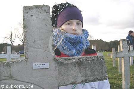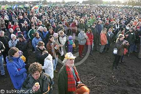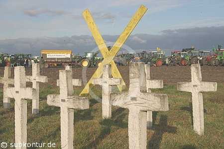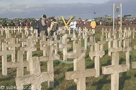 An einer Treckerdemonstration der "Bäuerlichen Notgemeinschaft" am Nachmittag des 20.11.05 auf einem Acker in Klein Gusborn beteiligten sich 175 Traktoren und ca. 2500 DemonstrantInnen. Der Acker liegt unmittelbar neben dem "Ehrenfriedhof" für Bundestagsabgeordnete nach einem möglichen Supergau an der Castor-Transportstrecke. Unter den ca. 1000 Kreuzen sind u. a. auch Angela Merkel und Sigmar Gabriel symbolisch beerdigt.