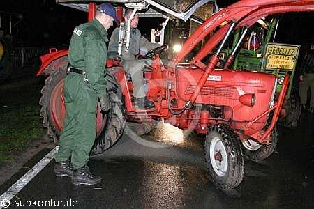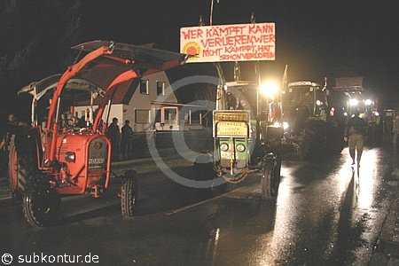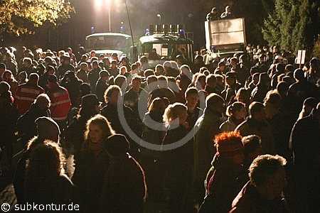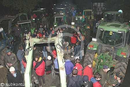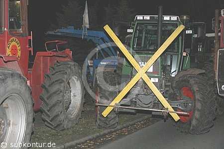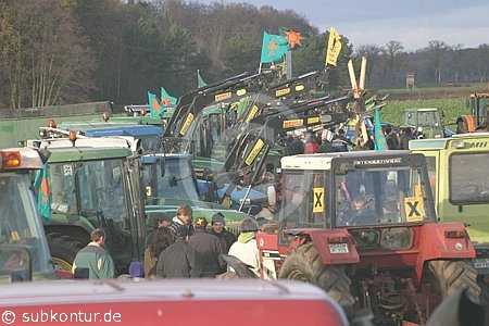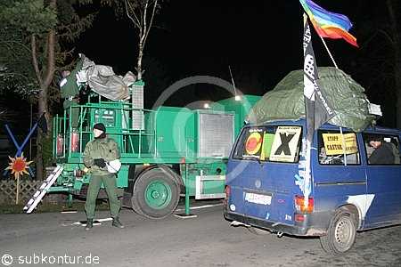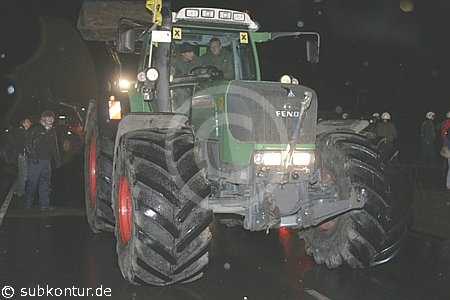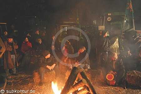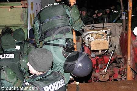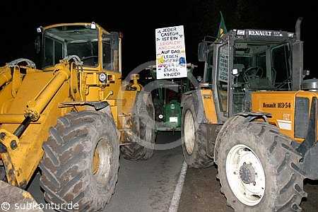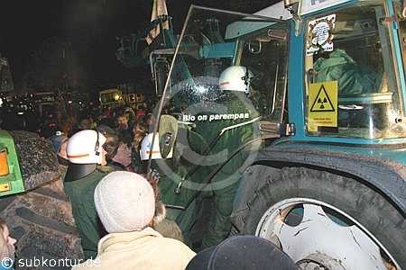 Im Anschluss an die Kundgebung blockierten etwa 160 Trecker und 600 DemonstrantInnen die Castor-Transportstrecke. Da die Landwirte der Aufforderung der Polizei, die Straße zu räumen, mehrheitlich nicht nachkamen, erklärte die Polizei deren Traktoren für beschlagnahmt. Darauf machten sich Experten der Polizei an die mühevolle Arbeit, die abgestellten Traktoren zu starten und zur Seite zu fahren. So wurden 79 Trecker festgesetzt. Um ca. 02.00 Uhr war die Blockade beendet.