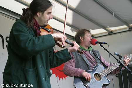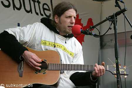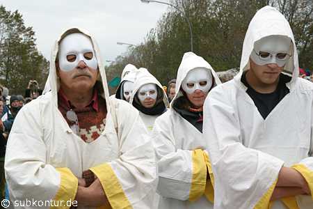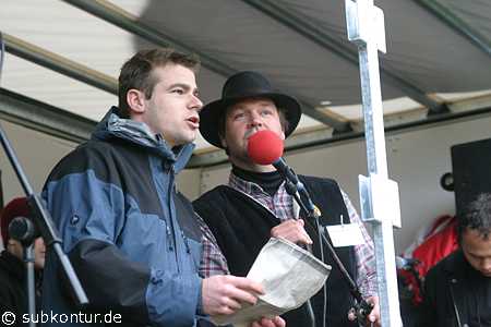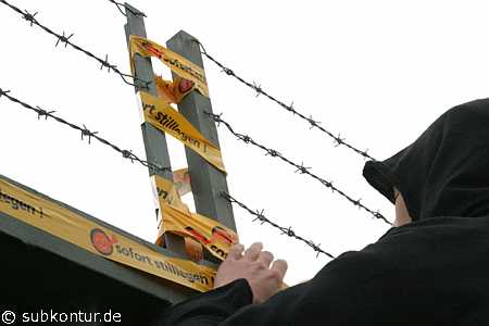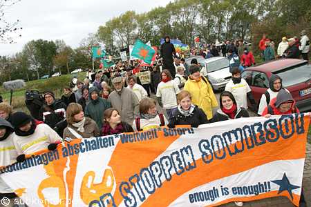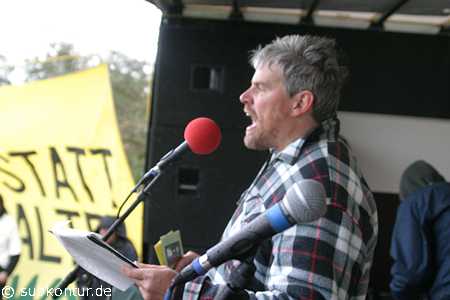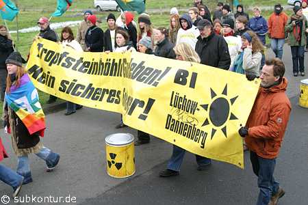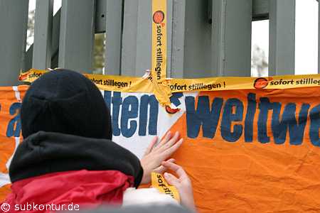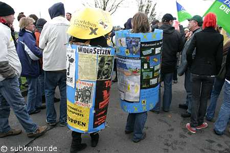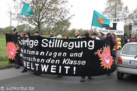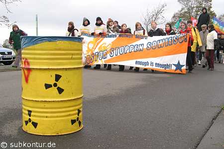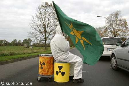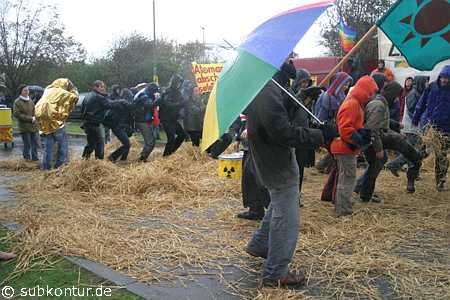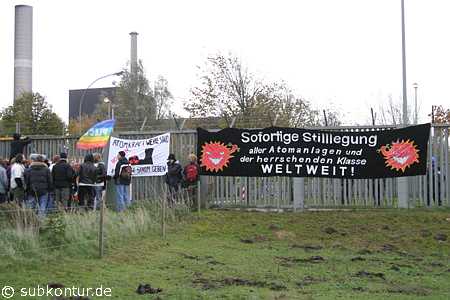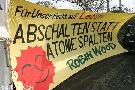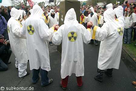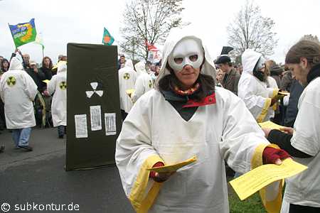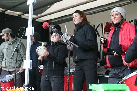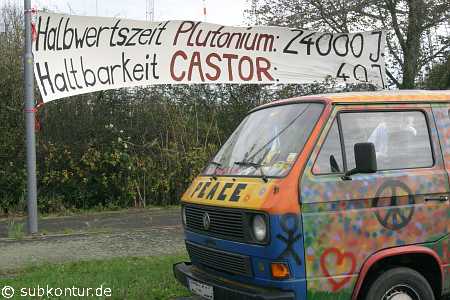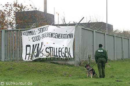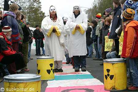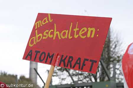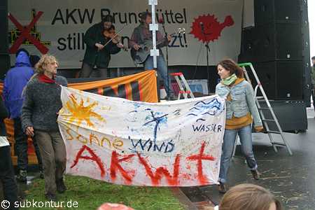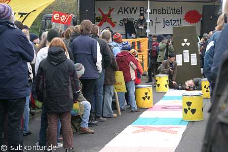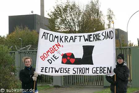 fotografie / presse-archivAKW Brunsbüttel stilllegen – jetzt! Laufzeitverlängerung verhindern!Unter dieser Forderung hatte ein Bündnis verschiedener Antiatominitiativen zu einer Demonstration vor dem AKW Brunsbüttel aufgerufen, die am 04.11.06 stattfand. Zu diesem Bündnis gehören u.a. der Aktionskreis Stilllegen Sofort (AKS) Brunsbüttel, verschiedene BUND-Organisationen, contrAtom Buchholz/Winsen/Rotenburg/Göttingen, Gewaltfreie Aktion Atomwaffen Abschaffen (GAAA), Graswurzelgruppe Kiel, Internationale Ärzte für die Verhütung des Atomkrieges/Ärzte in sozialer Verantwortung e.V. (IPPNW), ROBIN WOOD, Systemoppositionelle Atomkraft Nein Danke Gruppe Hamburg (SAND) und X-tausendmal quer. Hintergrund der Demonstration ist die Tatsache, dass kaum ein anderer Reaktor in Deutschland so häufig auf Grund von Pannen und Störfällen vom Netz genommen werden musste wie das AKW Brunsbüttel. Die beiden Betreiber, die Stromkonzerne Vattenfall und E.on hatten sich im „Atomkonsens“ verpflichtet, das AKW Brunsbüttel an der Unterelbe bis spätestens 2009 stillzulegen. Doch jetzt wollen die Betreiberfirmen die Laufzeit verlängern in der Hoffnung, dass nach den nächsten Bundestagswahlen der Atomkonsens gekippt wird. Das soll natürlich verhindert werden! Die Veranstalter hatten etwa 200 TeilnehmerInnen erwartet , aber erfreulicherweise kamen 400, und das trotz einer zeitlich parallel laufenden Demonstration gegen einen Aufmarsch der NPD in Bremen. Ein voller Erfolg also! Und die Anwesenden wurden belohnt mit zündenden Redebeiträgen (u.a. Bettina Dannheim von Robin Wood und Jochen Stay von x-tausendmalquer) und einem sehens- und hörenswerten Angebot an kulturellen Beiträgen : Die "Atomianer" beeindruckten mit einer Performance, „Keldi“ begeisterte durch seine politischen Lieder, "Strom und Wasser" brachten ihre Anliegen mit bissiger politischer Satire auf den Punkt, ein Chor von x-tausendmalquer motivierte zum Mitsingen eines humorvollen Castorsongs und die Sambagruppe „batang“ aus Hamburg heizte den regendurchnässten Anwesenden mit ihren Sambarhythmen ordenlich ein. Insgesamt also eine hervorragende Stimmung, zudem auch mittels warmer Getränke und Backwaren für das leiblich Wohl gesorgt war. Einer der Höhepunkte der Veranstaltung war übrigens eine per Handy hergestellte Lifeschaltung zur zeitgleichen Demonstration mit etwa 400 TeilnehmerInnen vor dem AKW Biblis , dessen Betreiber ebenfalls eine Laufzeitverlängerung anstrebt. Wer seinen persönlichen Atomausstieg betreiben möchte, kann diesen kinderleicht unter STROMWECHSEL JETZT! vollziehen. Weitere Fotos vom AKW Brunsbüttel bei seitenpfad.de