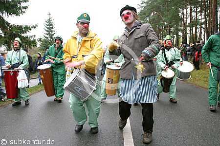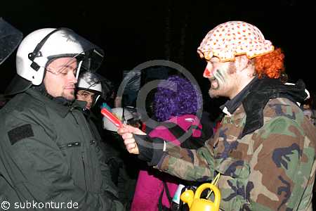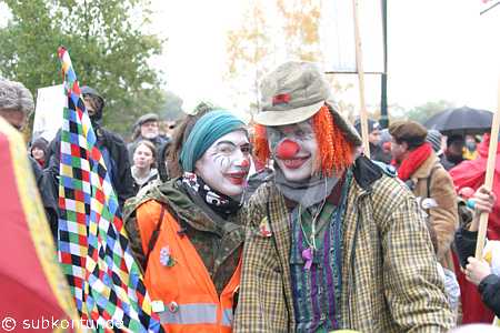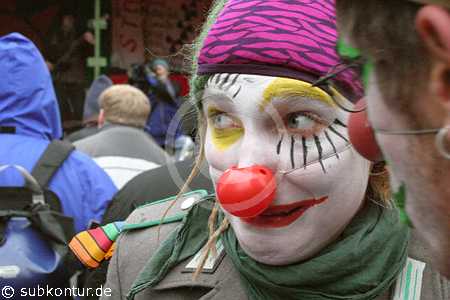 Neu im Wendland, aber nicht zu übersehen, die Clownsarmy, die mit ihrem subversiven Clownshumor die Umstehenden erheiterte und die Polizei des öfteren irritierte, weil Mimik und Gestik sich der Interpretation gewohnter Verhaltensweisen entziehen.