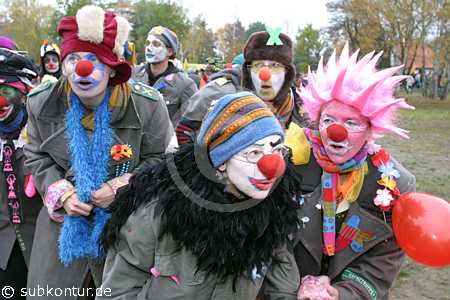 6 Clownsarmy in alten Militärmänteln der ehemaligen NVA