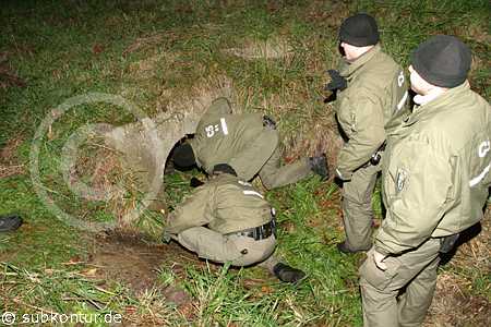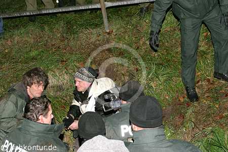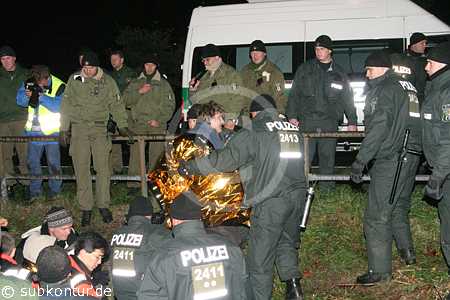 fotografie / presse-archivCastortransport 2006 - Ankettaktion unter der B 191Es erreichte uns in der Nacht des 12.11. während der Straßenblockade vor dem Verladekran die Nachricht, ganz in der Nähe hätten sich unter der B 191 Leute angekettet. Fototermin dort. Die Polizei verhält sich restriktiv gegenüber der Presse. Man kann nicht viel sehen. Die Lage: In einem etwa 50 m langen Düker, welcher diagonal die Straße kreuzt, befinden sich Personen. Die Berliner Polizei berät die Lage. Beamten kriechen mit Taschenlampen in das Rohr unter der Straße. Sie kommen wieder heraus: Zwei Frauen und zwei Männer hätten sich dort angekettet und vor sich scharfe Krallen in das Rohr eingebracht. Also mögliche Verletzungsgefahr. Verstärkung und Gerät wird angefordert. Zwei Seelsorgerinnen erscheinen. Gemeinsame Beratungen. Wieder kriecht ein Beamter in das Rohr. Nach einiger Zeit des Verhandelns geben die Vier auf. Sie kommen nacheinander heraus und werden gleich in Wärmeschutzfolien gehüllt. Wenig später erscheinen die beiden Frauen bei der Straßenblockade von X-tausendmalquer und werden von Jochen Stay per Megafon interviewt. Beifall von den Anwesenden. Weitere Fotoberichte:6000 bei Auftaktdemonstration in Gorleben Fahrradrallye vom Verladekran in Dannenberg nach Gorleben und "Stuhlprobe" Straßenblockade von X-tausendmalquer und WiderSetzen am Verladekran in Dannenberg | ||