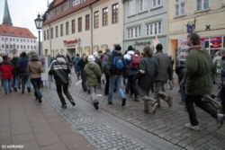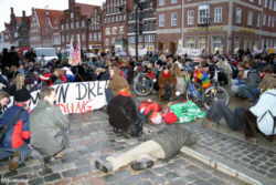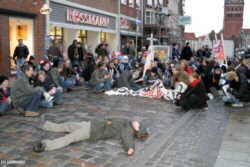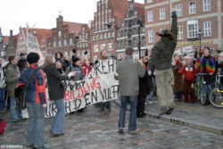 fotografie / presse-archiv© Gisela und Joachim Petersen, subkonturKontakt: siehe Startseite STARTSEITE Kreativer Protest bei Studentendemonstration durch die Innenstadt LüneburgsBunt ging es zu auf dem Uni-Campus, wo sich am 20. Januar 2004 etwa 1400 StudentInnen zu einer Protestdemonstration versammelten. Viele „letzte Hemden“ flatterten an langen Wäscheleinen vor dem Gebäude 9 und zeigten symbolisch die Situation vieler Anwesender, sollten tatsächlich Studiengebühren eingeführt werden. Satirisch treffend die Text-Metaphern auf Großtransparenten wie: „Strathmann dreht die Bildung durch den Wulff.“Dann bewegte sich ein langer, plakatbunter und zuweilen lauter Zug vom Campus in die Lüneburger Innenstadt. Während häufiger kurzer Stopps wurden Protest- und Kampfbereitschaft skandiert: „Sie wollen kürzen, wir werden kämpfen!“ Dann wieder erklang aus vielen Kehlen eine Variante des allbekannten Sesamstraßenliedes: „Wer, wie, was, wieso, weshalb, warum – wer nicht zahlt bleibt dumm.“ Auf dem Platz Am Sande angekommen, sorgten die StudentInnen für Aufsehen und auch Erheiterung, als sie auf Kommando ein Bildungssterben inszenierten und sich zu Hunderten auf den Boden fallen ließen. Einen weiteren sinnfälligen Halt gab es dann vor dem Hauptgebäude der Sparkasse an der Münze. Hier wurde laut und öffentlich die ironische Frage nach der Kreditwürdigkeit studienverarmter StudentInnen gestellt. Sie gipfelte in der erstaunt geäußerten Erkenntnis, dass in Bezug auf die Studiengebühren ein Kreditpotential von etwa einer halben Million Euro vor dem Eingang zur Sparkasse stehe. Den Abschluss der Demonstration bildete dann eine Kundgebung auf dem Marktplatz. Hier sicherte der Regionalvorsitzende des DGB Dietrich den StudentInnen die Unterstützung der Gewerkschaft zu. Als sehr erfreulich ist die Tatsache zu bewerten, dass die StudentInnen den geplanten Bildungsabbau in einem engen Kontext mit dem Sozialabbau in dieser Gesellschaft verstehen, was sie in mehreren Redebeiträgen und ferner auf etlichen ihrer Plakate zum Ausdruck brachten. Weitere Informationen gibt es beim ASTA der Universität Lüneburg. Die folgenden Fotos können als JPG 750x500 zur Ansicht geladen werden. Wir weisen in diesem Zusammenhang ausdrücklich auf unser Copyright hin! | |