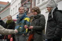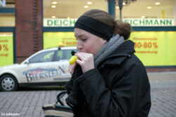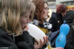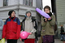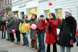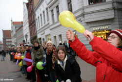 fotografie / presse-archiv© Gisela und Joachim Petersen, subkonturKontakt: siehe Startseite STARTSEITE Streikende StundentInnen lassen Bildungsträume platzenIm Rahmen der studentischen Protestveranstaltungen während der Streikwoche an der Universität Lüneburg versammelten sich am 23.01. etwa 30 StudentInnen am Rande des Marktplatzes, um eine sehr ansprechende politische Aktion vorzubereiten:Da wurden zunächst Luftballons verteilt, die aufgeblasen werden mussten. Diese Handlung gestaltete sich zu einem Ereignis, bei dem viel gelacht wurde, zeigte sich doch das Aufblasen bei einigen TeilnehmerInnen als überaus schwierig. Je mehr Fehlversuche sich bei diesen einstellten, desto schneller erfolgte der Zwangsabbruch des Aufblasens wegen eines spontanen und unwiderstehlichen Lachreizes. Das lockerte aber auf und schließlich waren doch alle Ballons so weit gefüllt, dass sie als Schreibfläche geeignet angesehen werden konnten. Nun machten sogenannte „Eddings“ die Runde und verwandelten die Luftballons in symbolische Bildungsträume wie „Bildung für alle - und zwar umsonst!“oder „Reiche Eltern für alle!“ Auf ein Zeichen begab sich die Gruppe dann in die naheliegende Bäckerstraße und bildete dort eine lange Reihe. Überall gespannte Erwartung. Das erste Feuerzeug wurde gezückt, die Flamme gezündet und ein wenig ängstlich unter den bunten „Bildungstraum“ gehalten. Dann ein Knall, leichtes Erschrecken und folgend ein die Anspannung lösendes Lachen. So starben Knall auf Knall einer nach dem anderen die etwa 30 symbolischen Bildungsträume. Genau das Gegenteil wünschen sich die TeilnehmerInnen. Jedoch angesichts der Trends in der Bildungs- und Sozialpolitik müssen sie das Zerplatzen ihrer Bildungsträume befürchten. Deshalb die öffentliche Aktion. Diese haben wir mit vielen Fotos dokumentiert, um ihr das verdiente Gewicht zu geben. Weitere Informationen gibt es beim ASTA der Universität Lüneburg. Die folgenden Fotos können als JPG 750x500 zur Ansicht geladen werden. Wir weisen in diesem Zusammenhang ausdrücklich auf unser Copyright hin! | |